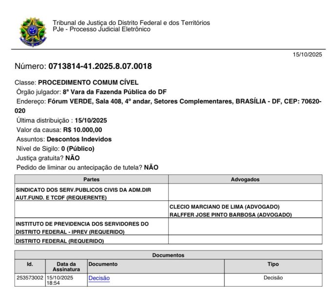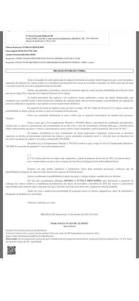 A juíza Mara Silda Nunes de Almeida, da 8ª Vara da Fazenda Pública do Distrito Federal, deferiu tutela provisória determinando a suspensão imediata da cobrança dos valores relativos à contribuição previdenciária dos meses de novembro e dezembro de 2020.